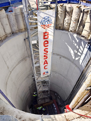 To lower the mini-tunnel boring machine, a 20 m deep well was dug. Its walls are made of concrete sheaths which, filled with concrete and protected by a reinforced concrete wall on the shaft side, constitute a structuring sheath descending 20 m. The concrete used is low carbon, made with CEM III cement to reduce the carbon footprint of the site. © PP