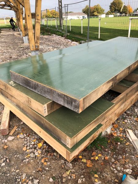 Panels for boxes with Unilin vapor barrier wall on the construction site of the locker room and Club House of Coincy in Aisne. © Jonas Tophoven