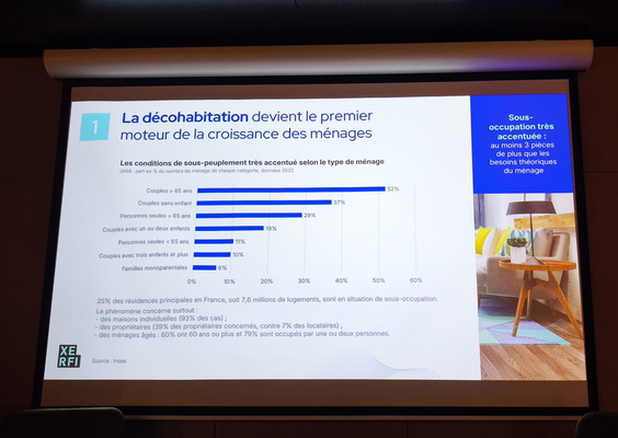 Another consequence of cohabitation according to Xerfi, under-occupancy of housing – defined as at least three rooms more than the theoretical needs of households – is increasing among elderly people, single and in couples, and among couples without children. According to Xerfi, as of now 25% of primary residences in France, or 7.6 million homes, are under-occupied. These are primarily individual houses in 93% of cases. Owners are significantly more concerned (39%) than tenants (7%). And these tend to be elderly households: 60% of sub-occupants are at least 60 years old and 70% of them are households of one or two people. © Xerfi